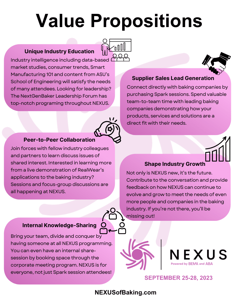 NEXUS provides four days to foster important connections, to stay informed of industry happenings, and to advance the professional development of every member of your team. You and your team will benefit from the many opportunities to network and collaborate with others in the industry. NEXUS offers your team a format designed to strengthen existing relationships between bakers and suppliers and create new ones. NEXUS is the pinnacle of the future of the baking industry.